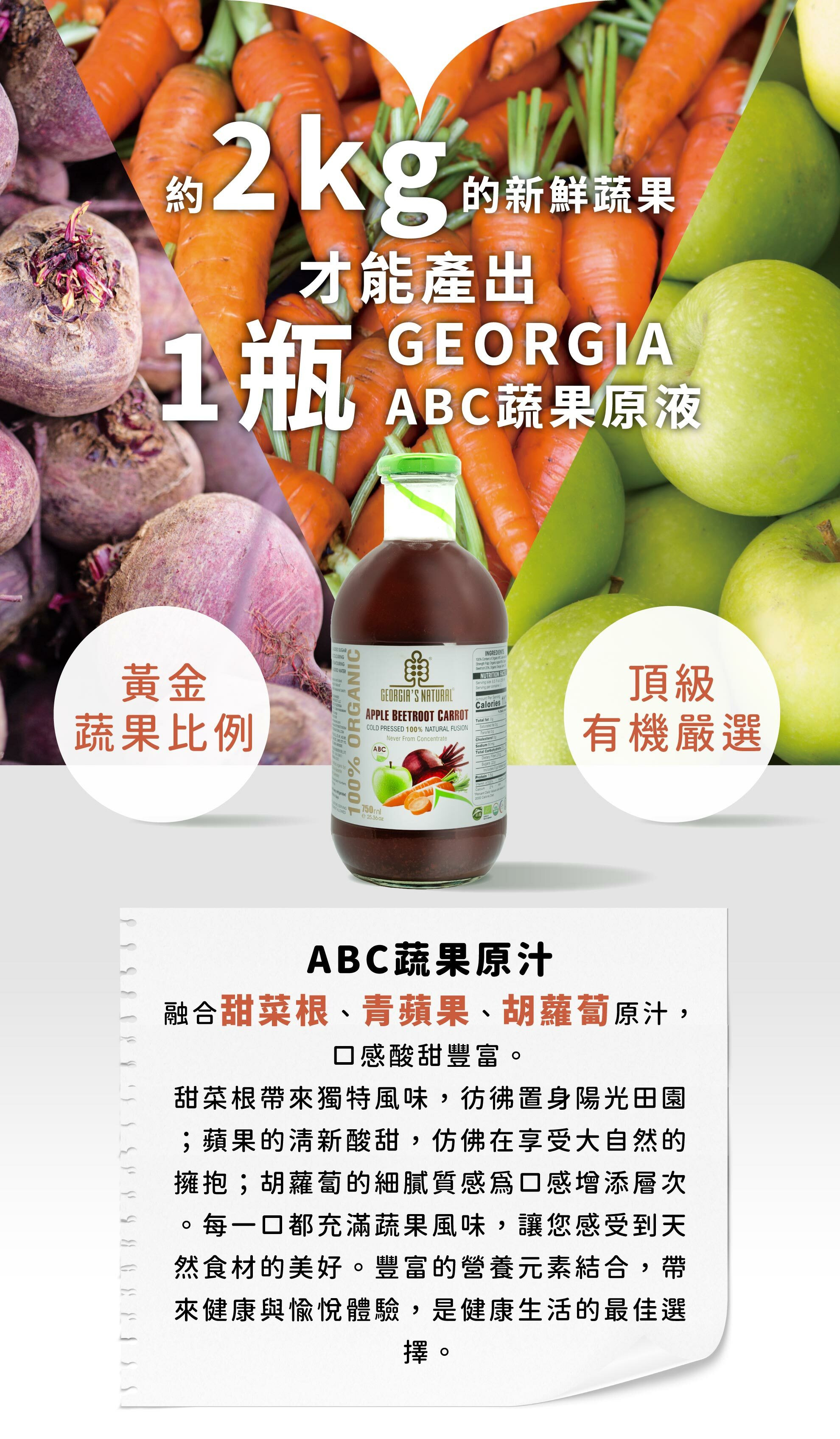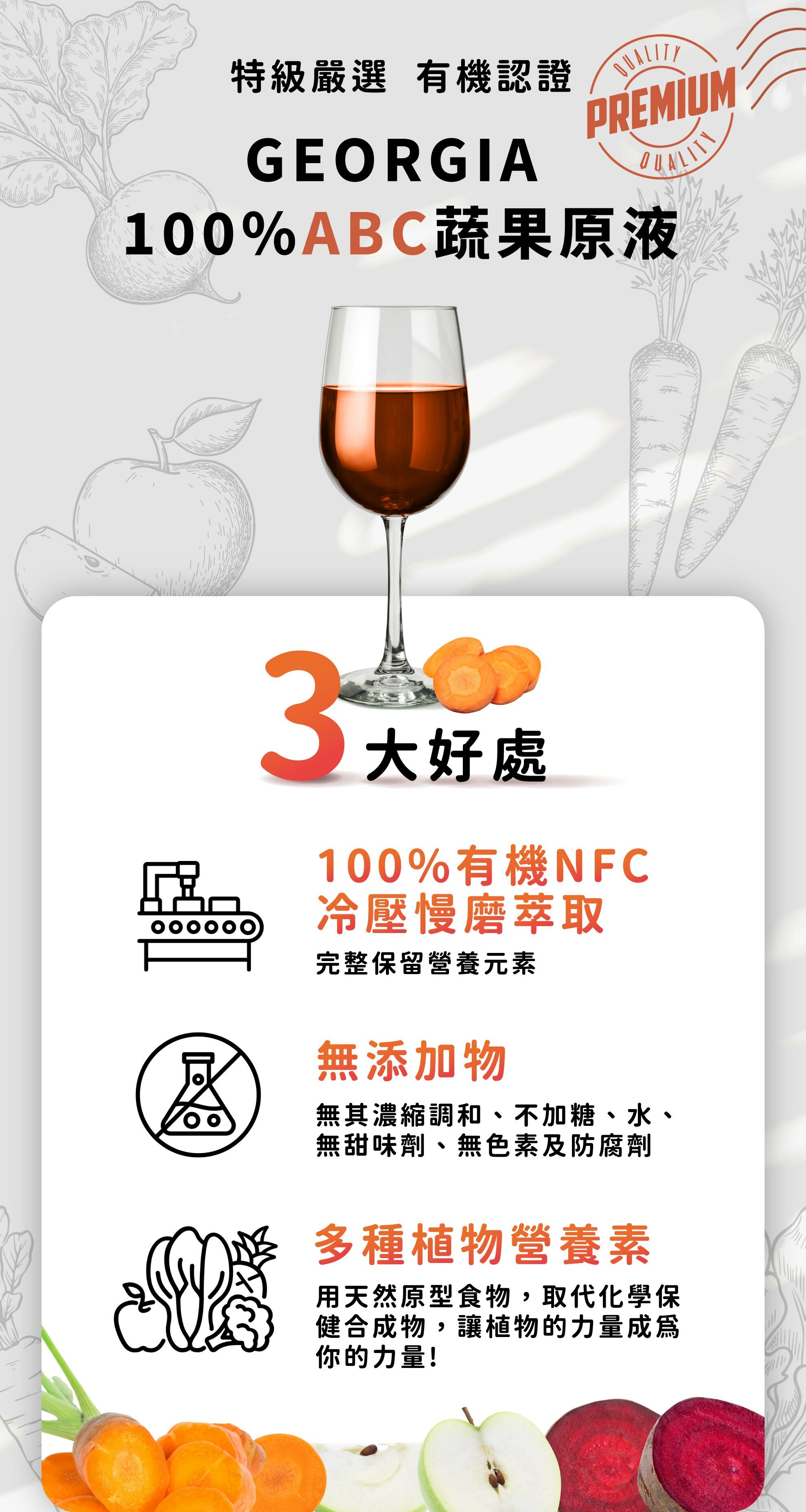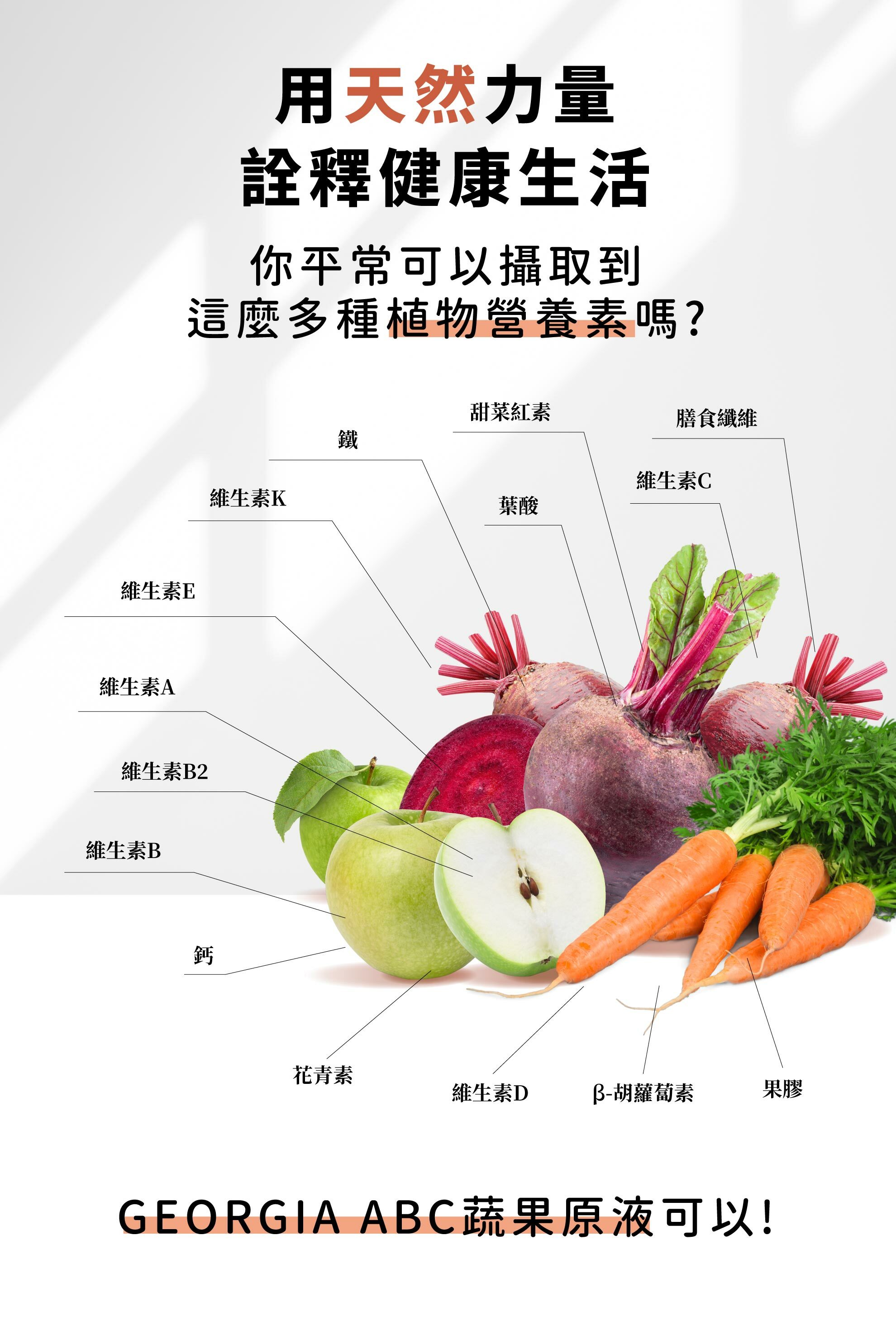 13.GEORGIA蔬菜汁有7款可選【芝麻葉汁、羽衣甘藍汁、紫甘藍汁、大黃瓜汁、甜菜根汁、紫蘿蔔汁、胡蘿蔔汁】