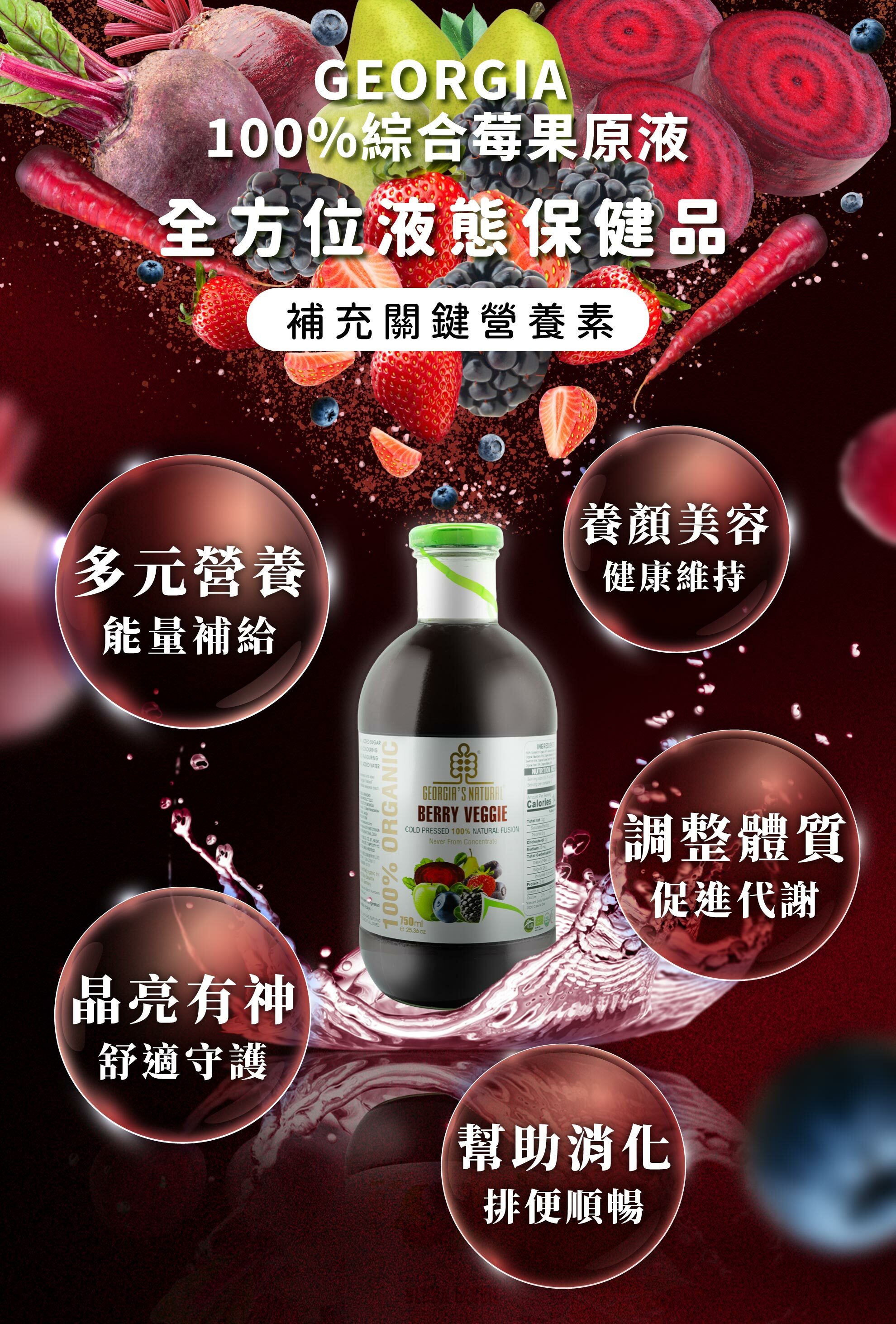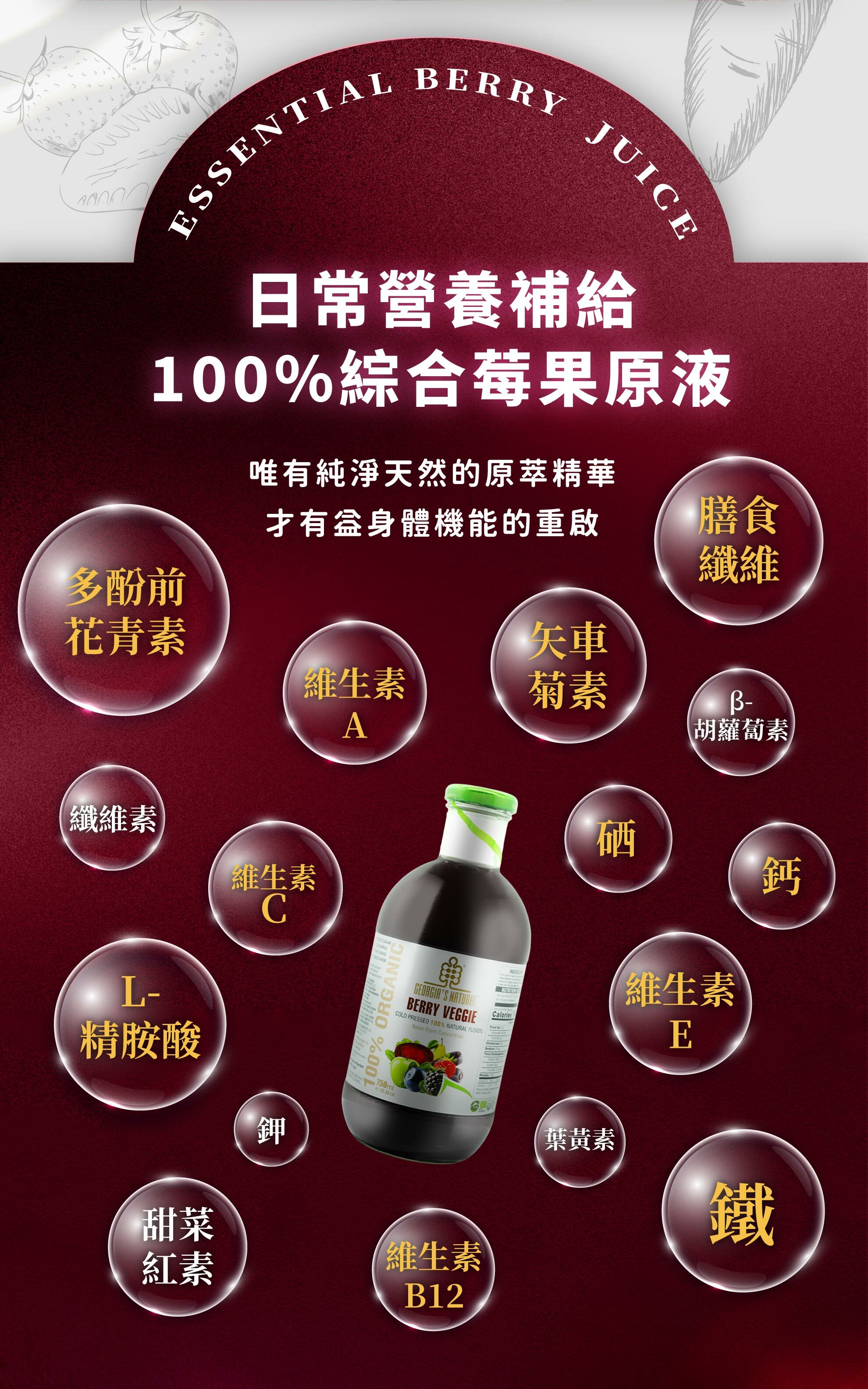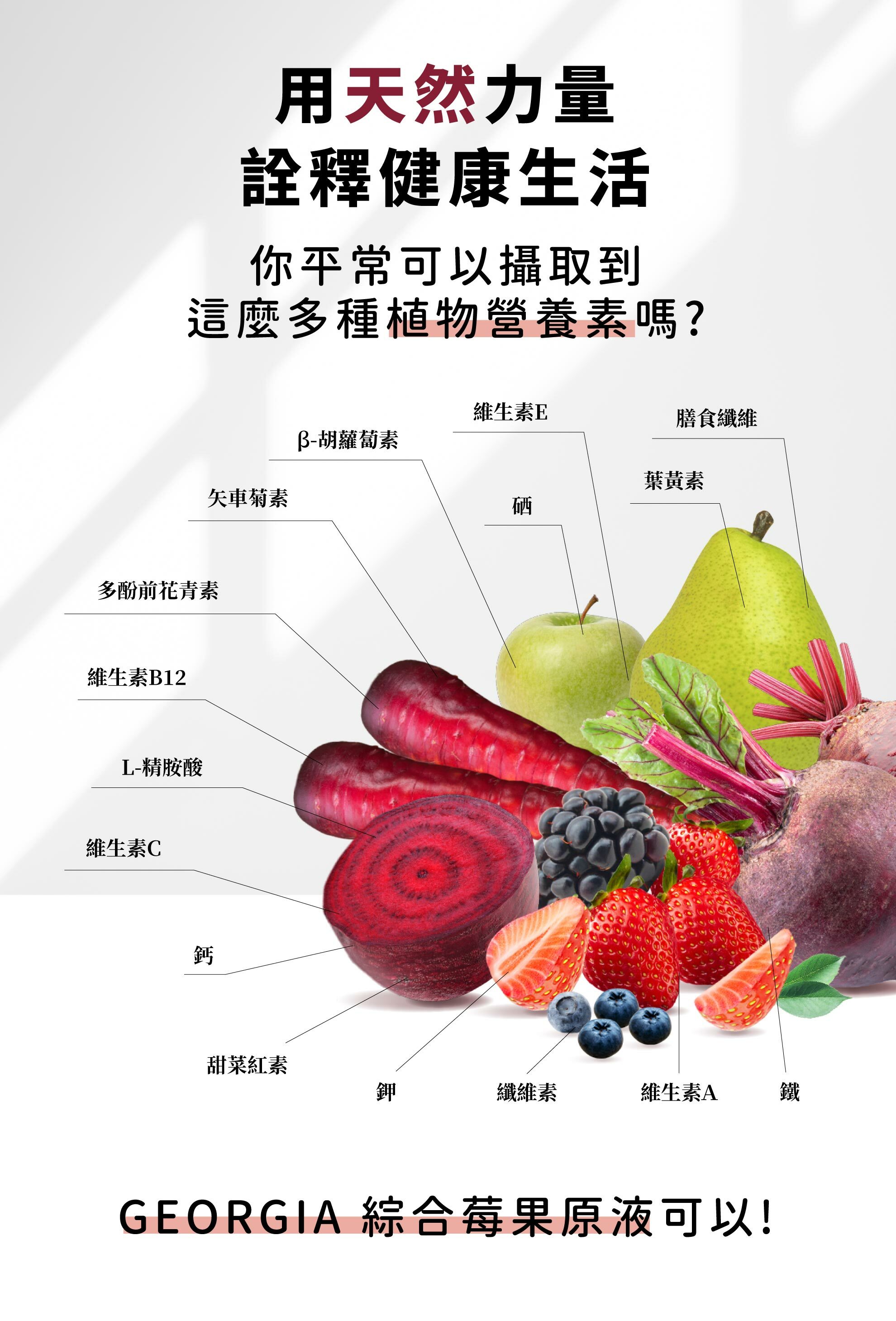成份:黑莓、草莓、甜菜根、紫胡蘿蔔、蘋果、梨、山桑子(原汁含有率100%)