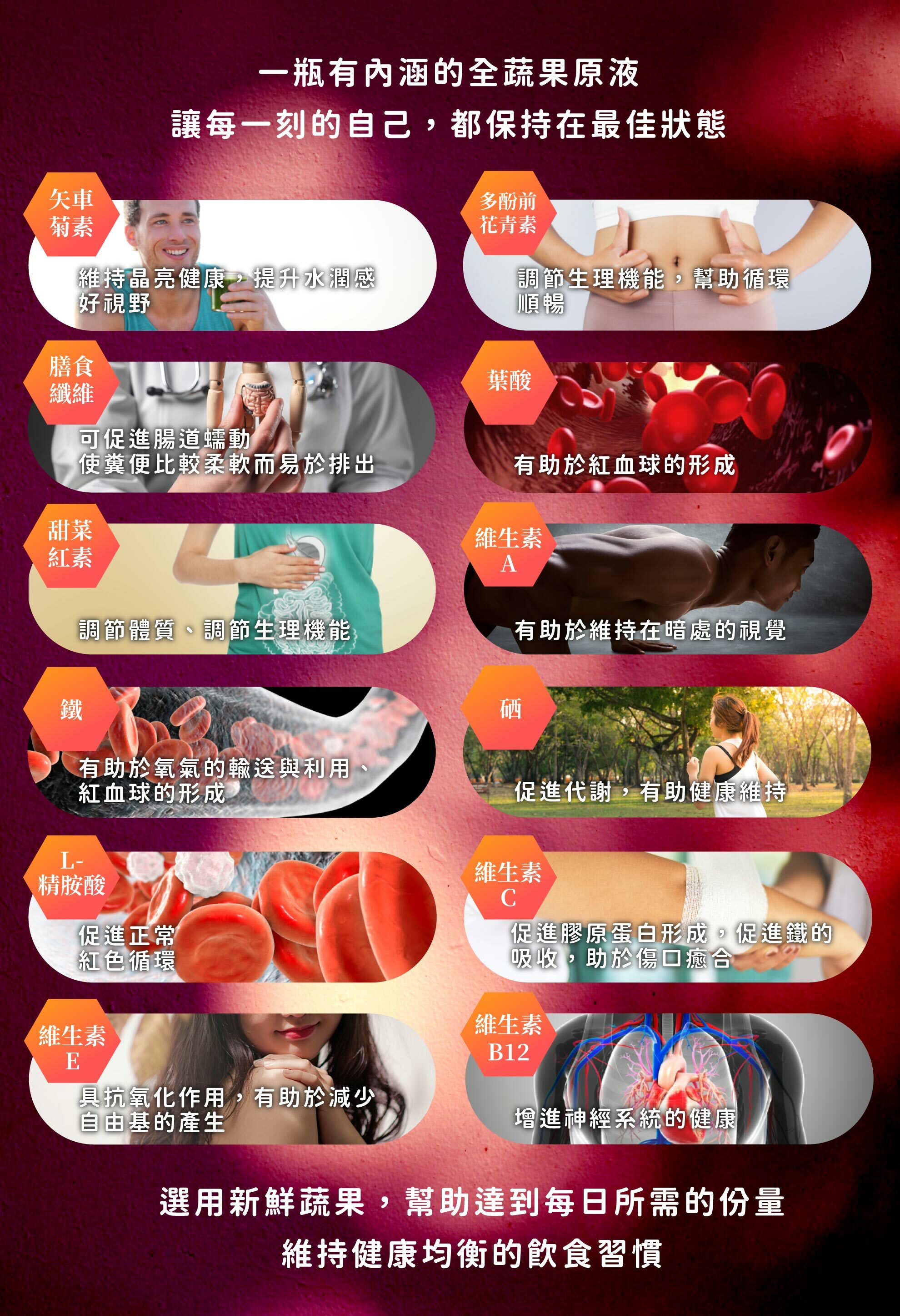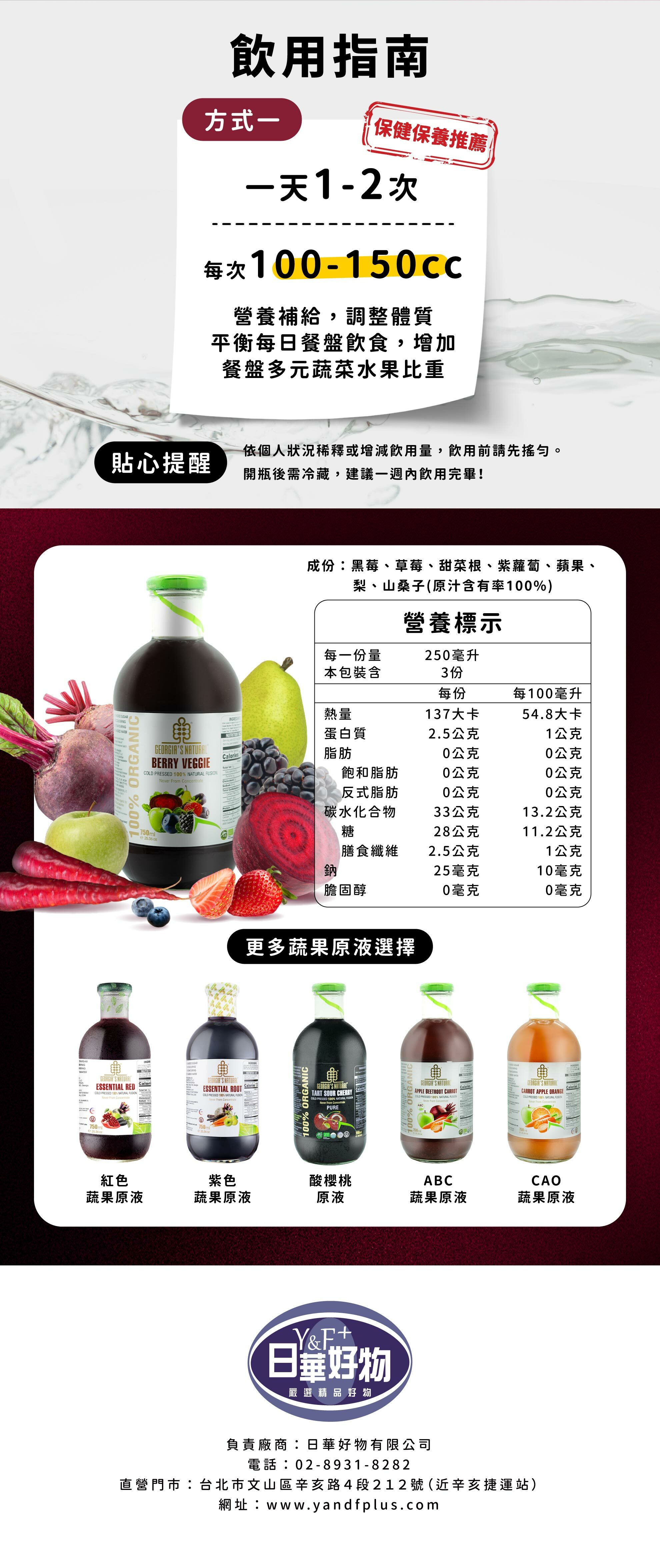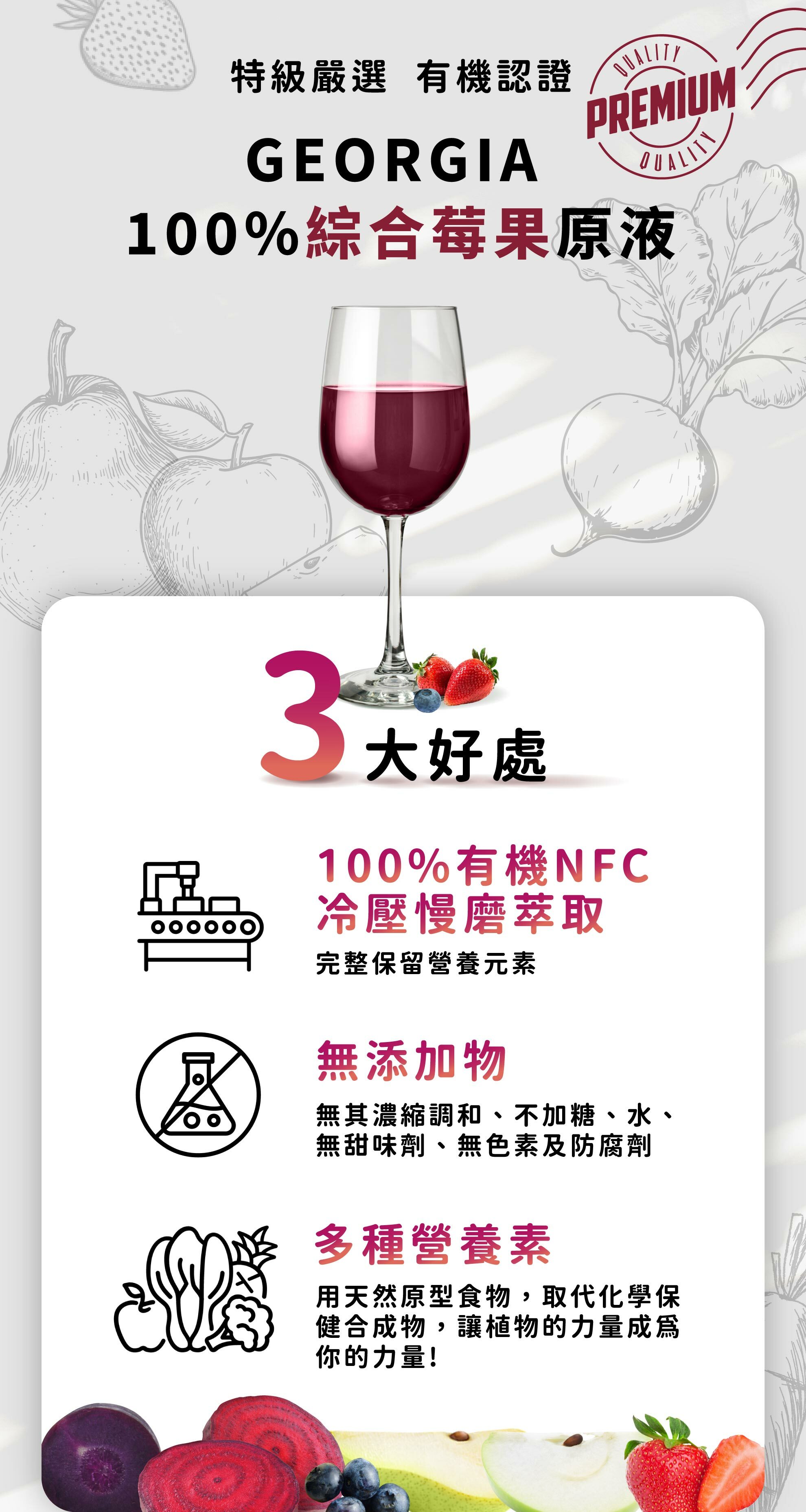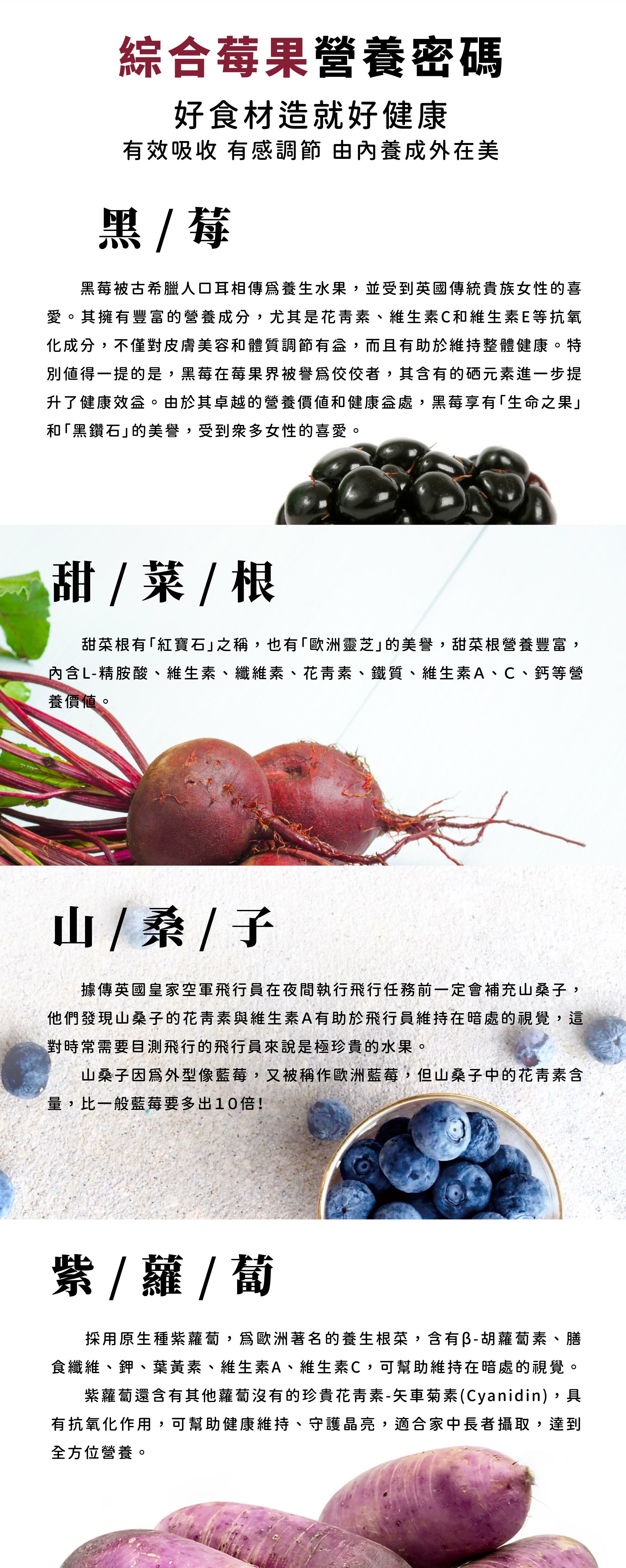 成份:黑莓、草莓、甜菜根、紫胡蘿蔔、蘋果、梨、山桑子(原汁含有率100%)