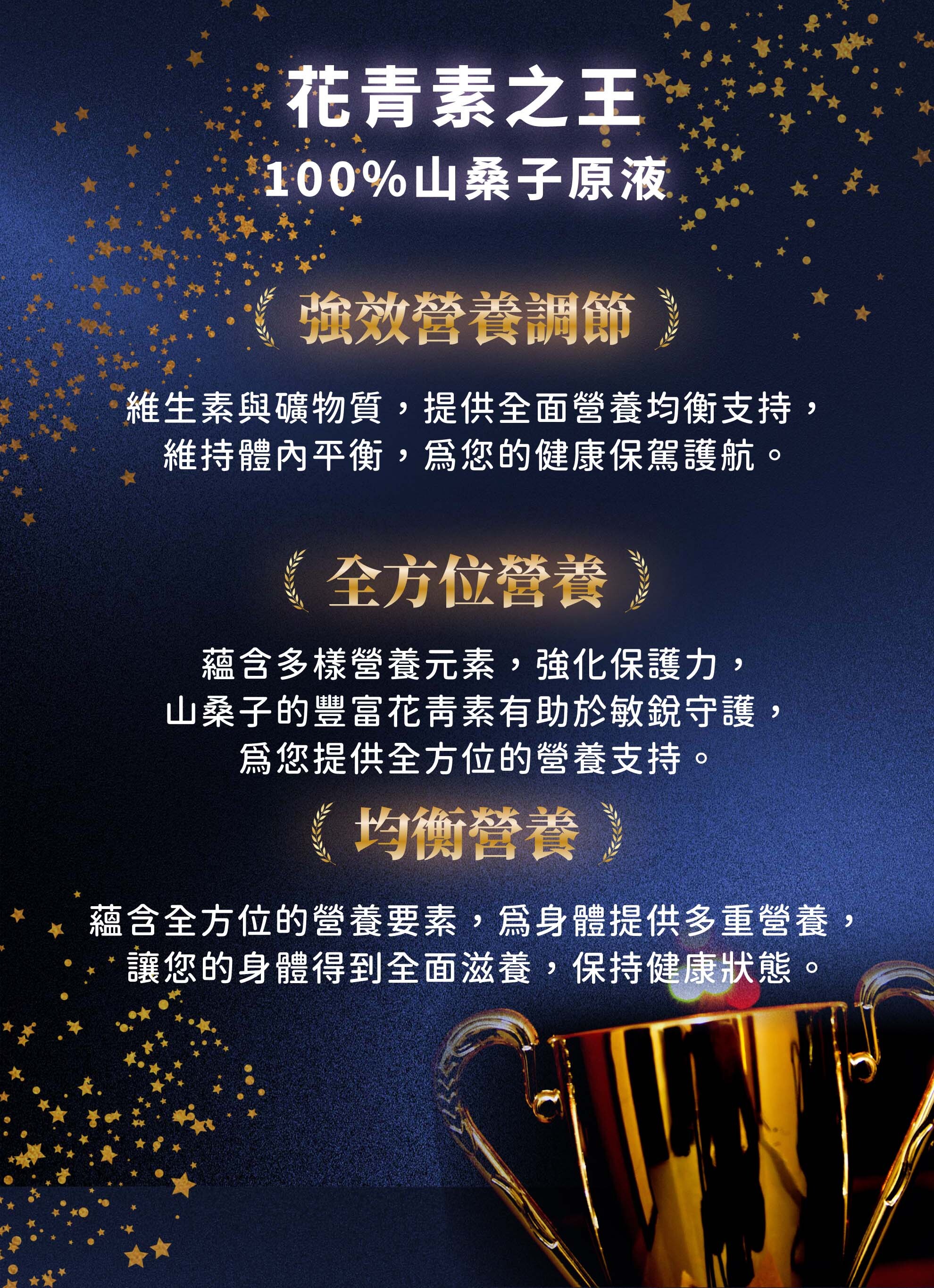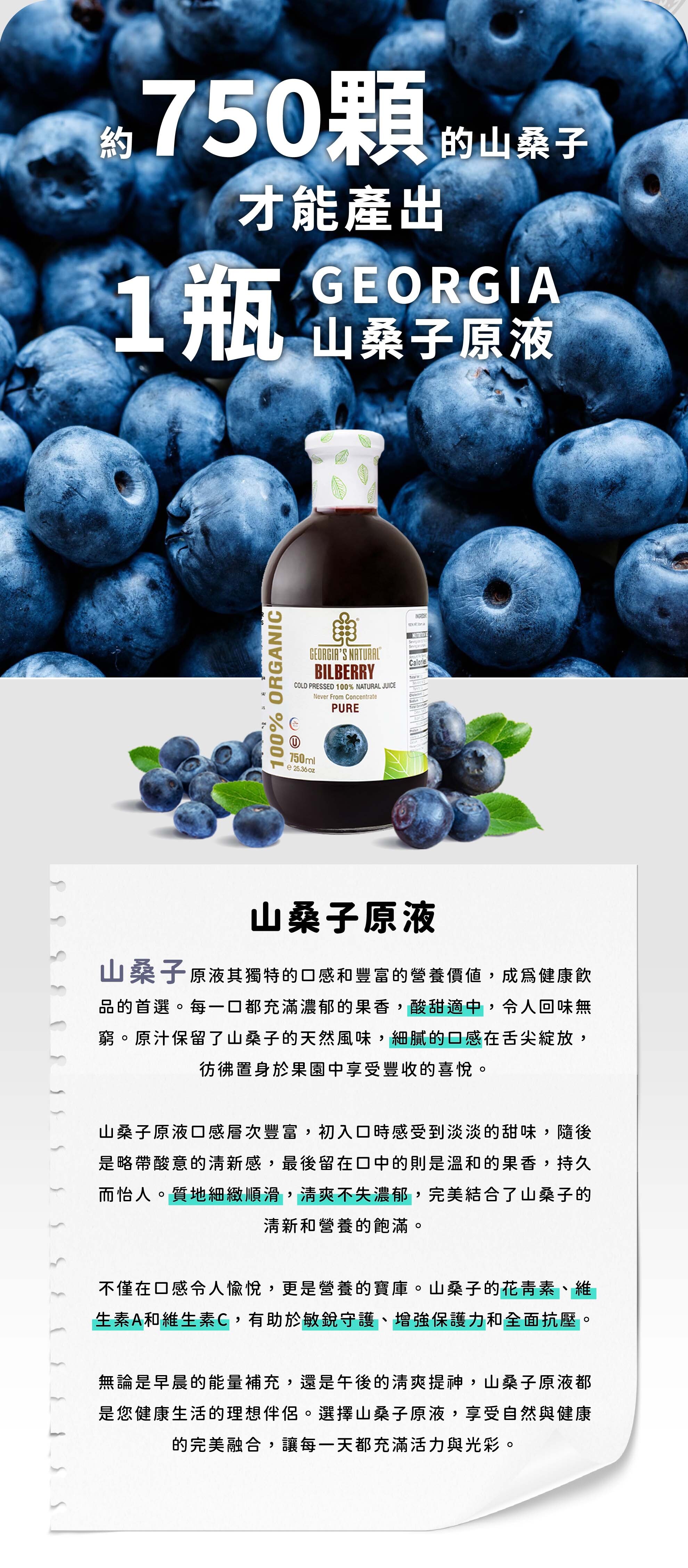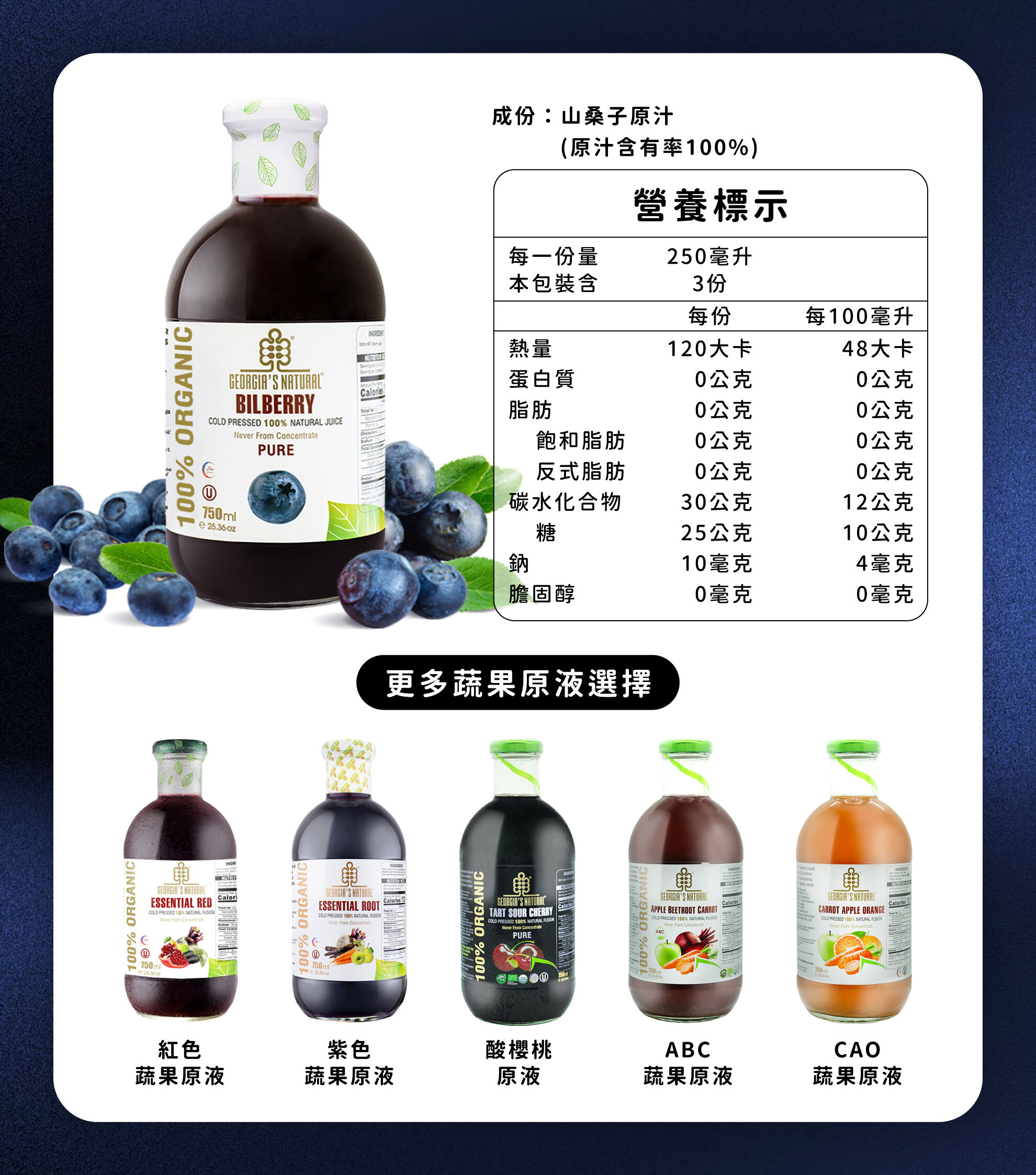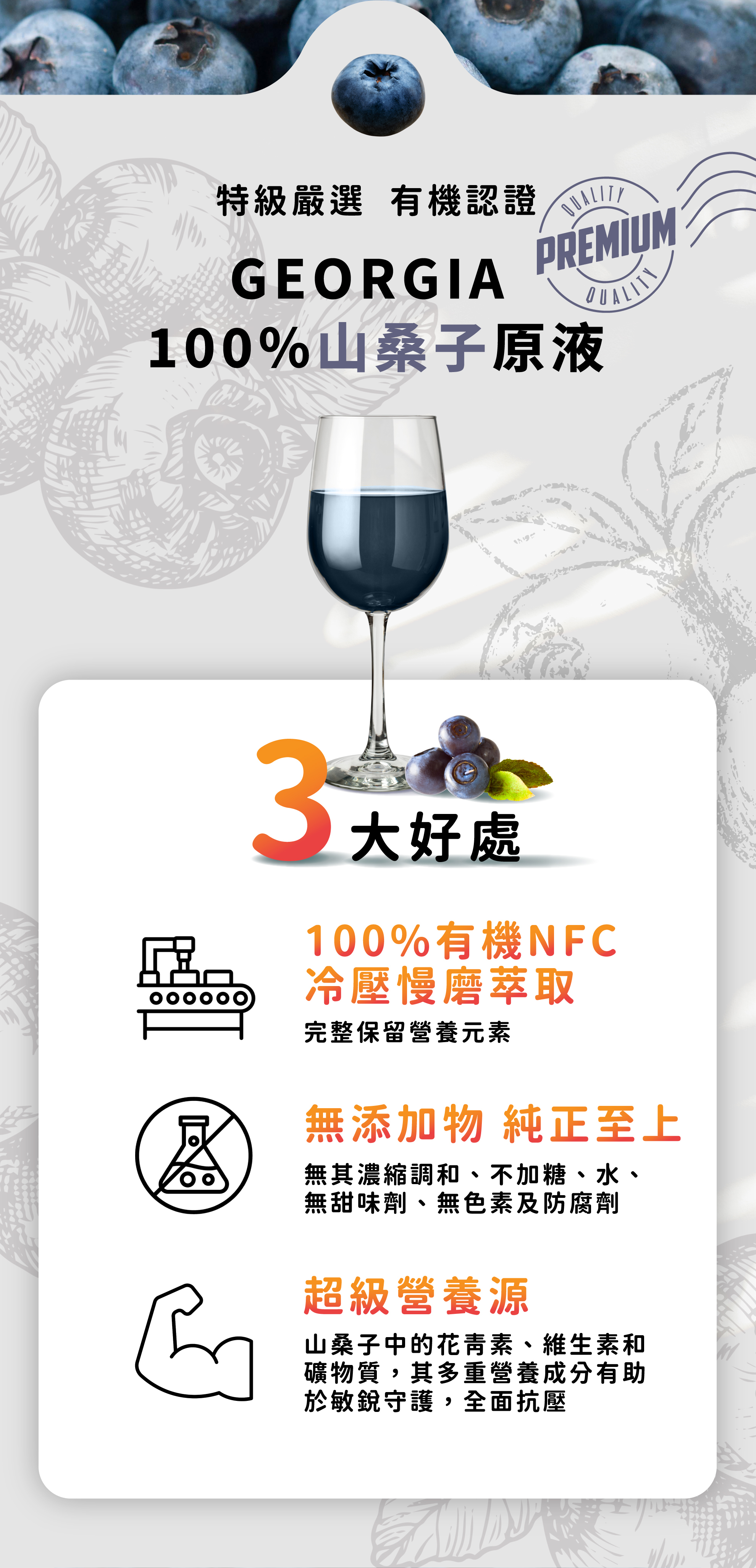 4.一瓶需要750顆山桑子,NFC冷壓慢磨萃取蔬果原汁,低溫超高壓殺菌,食用安心