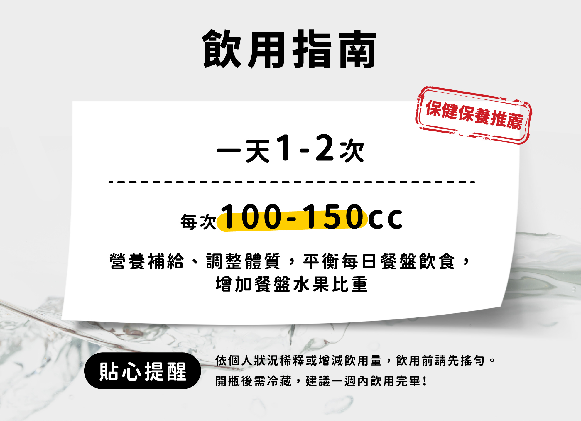 食用方法:建議每日200-250毫升,依個人狀況增減或稀釋。
