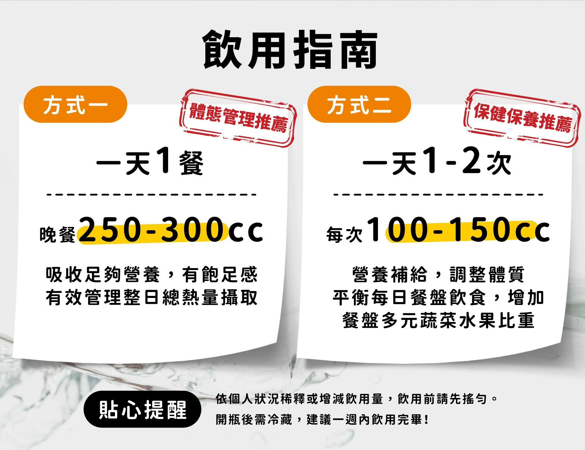 食用方法:建議每日 30-50 毫升 2-4次,依個人狀況增減或稀釋。