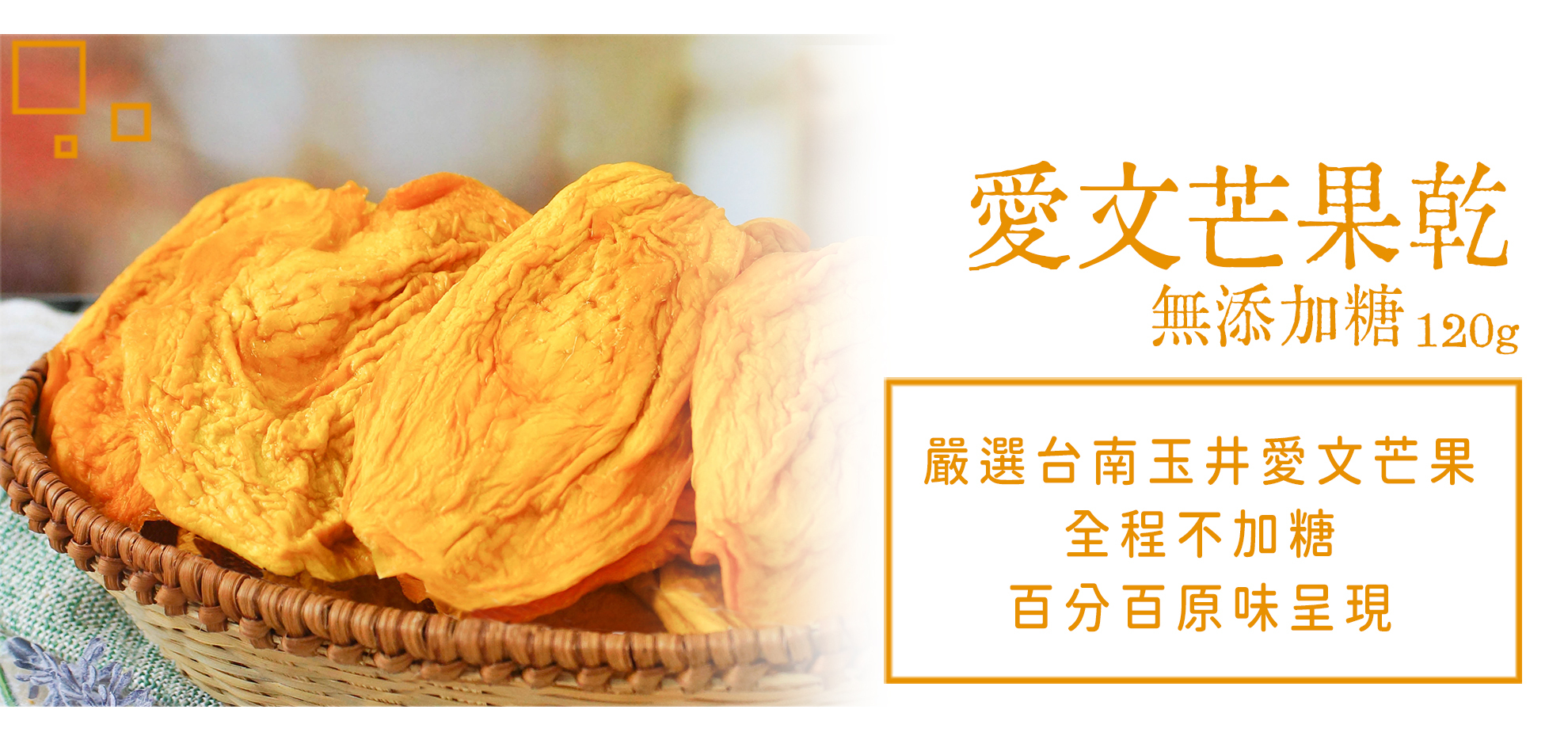 台灣水果乾中以愛文芒果乾最為出名,一顆芒果只能取兩片果乾,稀有好吃,也是日本人或外國旅客瘋狂購買的芒果乾伴手禮。嚴選台灣在欉紅水果製成,無添加人工色素、糖精等添加物,採用48小時低溫烘培,保留鮮果天然風味,精華濃縮!紮實口感,讓人愈吃愈唰嘴!天然營養又好吃!如果你是一個喜歡吃果乾的人,絕對知道天然果乾跟加工果乾的差別。最暢銷的愛文芒果乾、酸酸甜甜情人果乾,Q軟不澀紅心芭樂乾,極具風格的金鑽鳳梨乾、大人小孩都合宜的水果乾可供選擇。