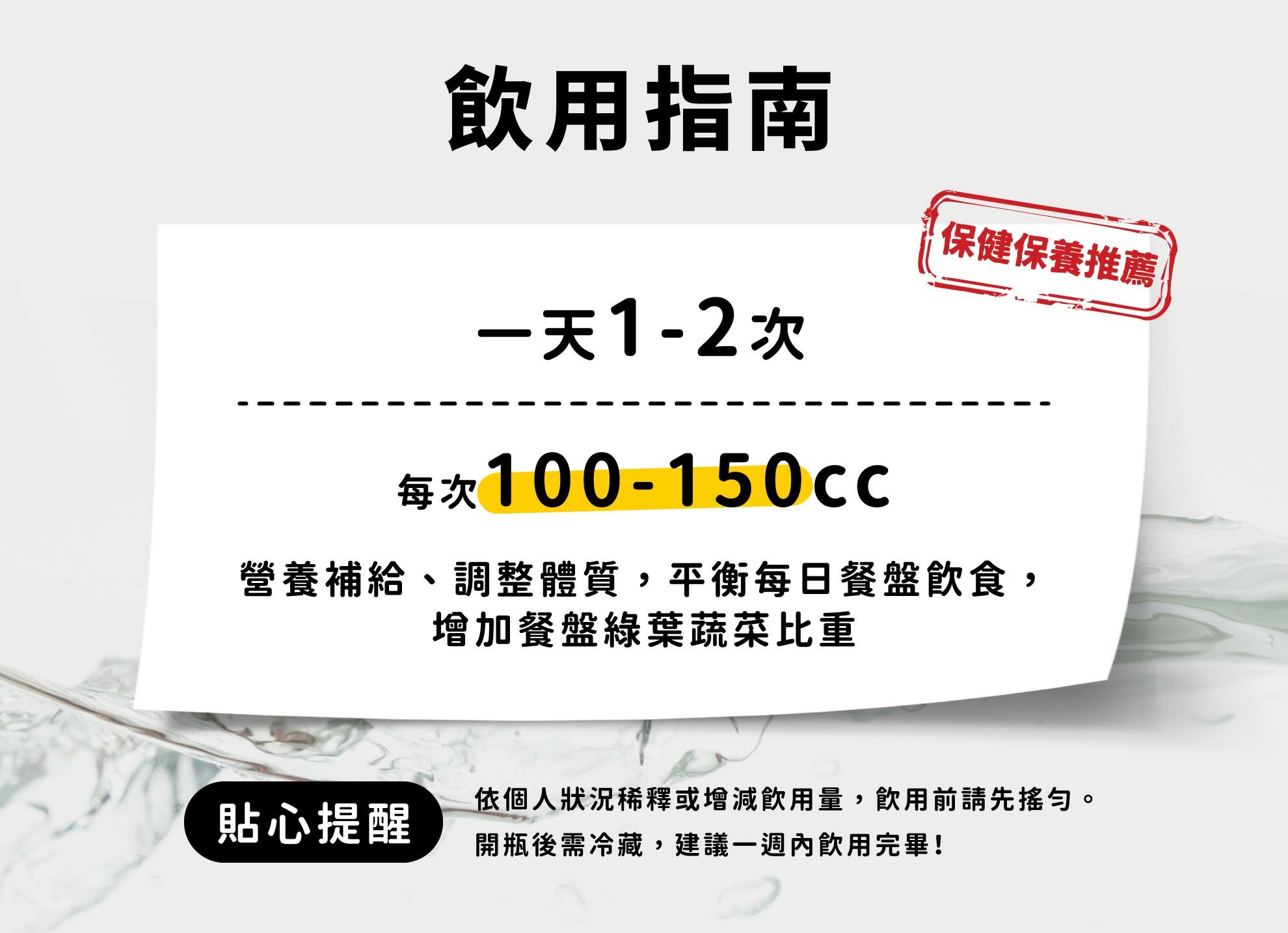 食用方法:建議每日200-250毫升,依個人狀況增減或稀釋。