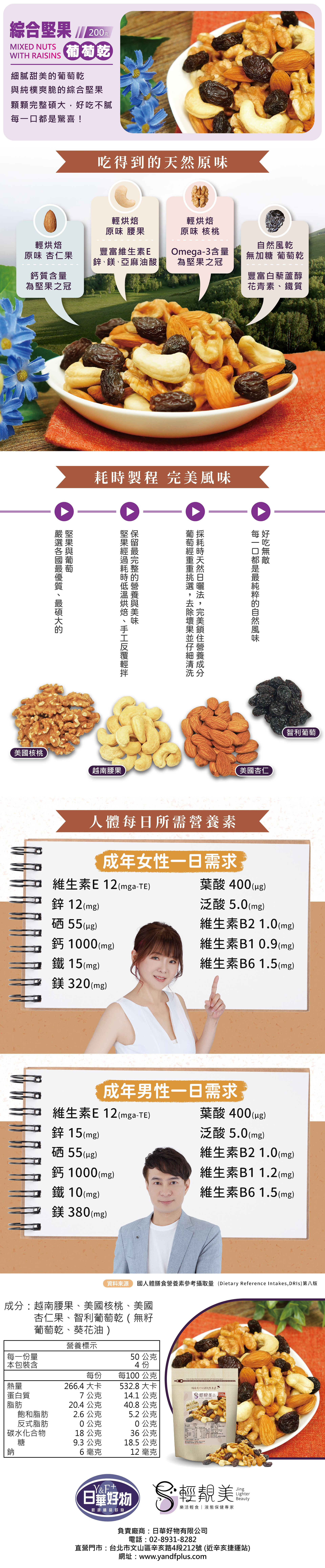 嚴選美國頂級核桃與杏仁、越南大腰果,搭配智利碩大葡萄乾。精選大顆完整飽滿果實,採耗時輕烘焙、天然日曬法製成,最大保留每顆果實的營養。