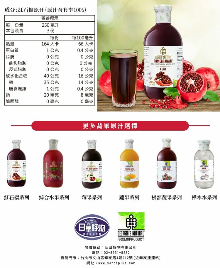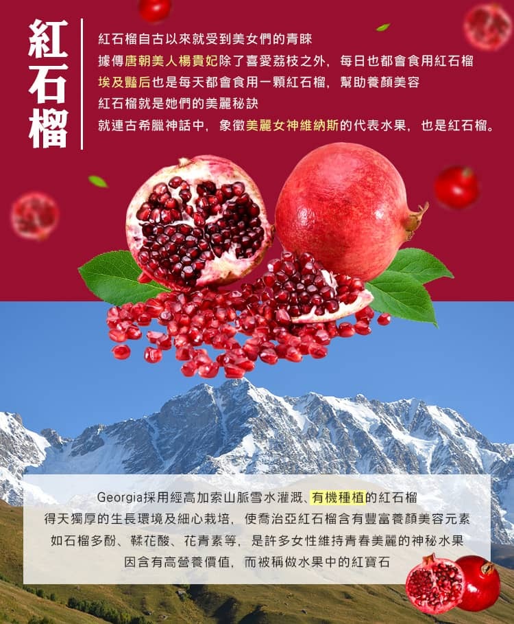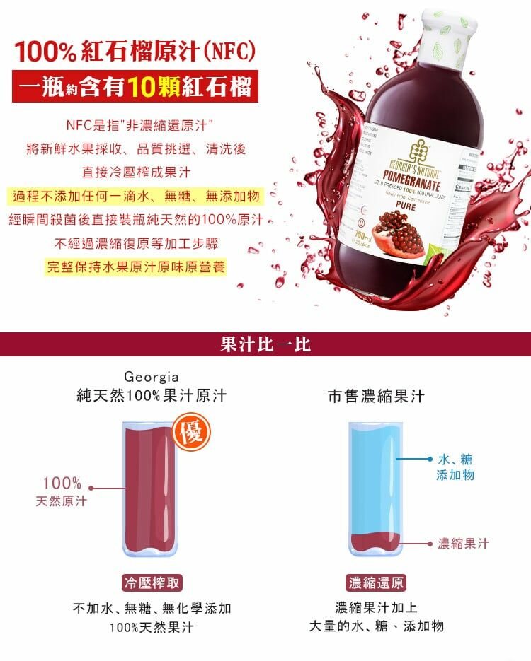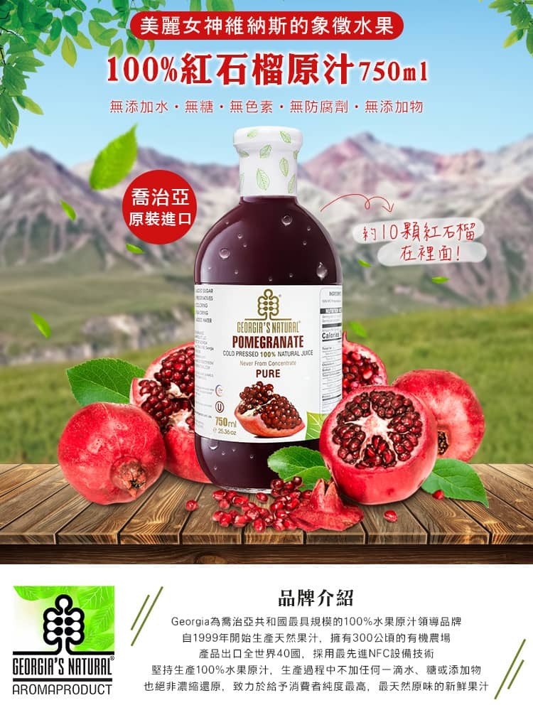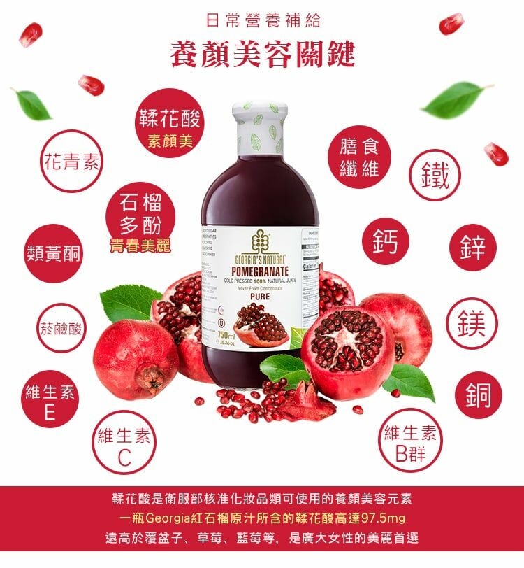 喬治亞原裝玻璃瓶,每瓶含有10顆紅石榴的果肉與籽冷壓鮮榨,根據原廠檢測報告含有鞣花酸約100毫克,是守護肌膚關鍵來源,同時紅石榴籽如同Q10輔酶酵素提供身體重要能量補給。