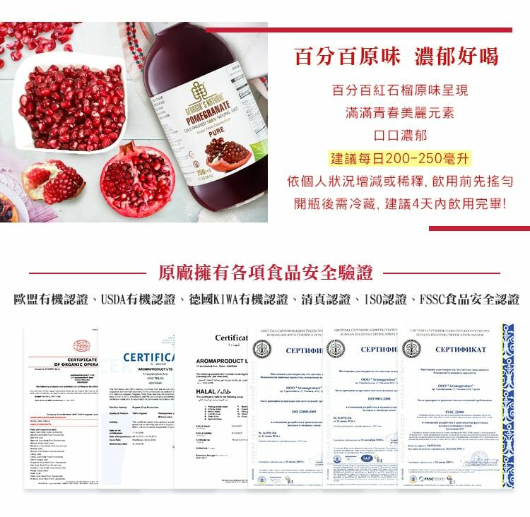 無加糖、非濃縮、無加水、無化學添加,冷壓製程保留紅石榴養分,是100%紅石榴原汁,同時獲得采園有機認證字號1-008-208651,有機紅石榴汁飲用更安心。
