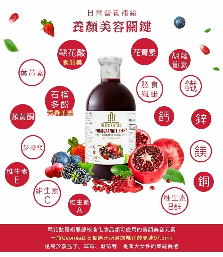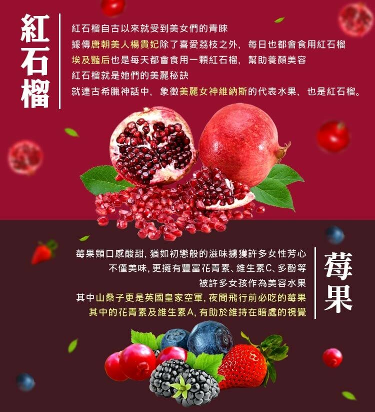 紅石榴中鞣花酸是守護肌膚關鍵,紅石榴籽提供身體重要能量補給,成分結合莓果獨特花青素、維生素C、抗氧化E、單寧酸、SOD超氧化物歧化酶,提供平日多元營養補給,養顏美容,青春美麗。
