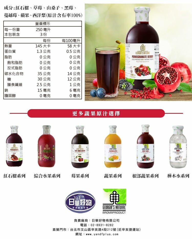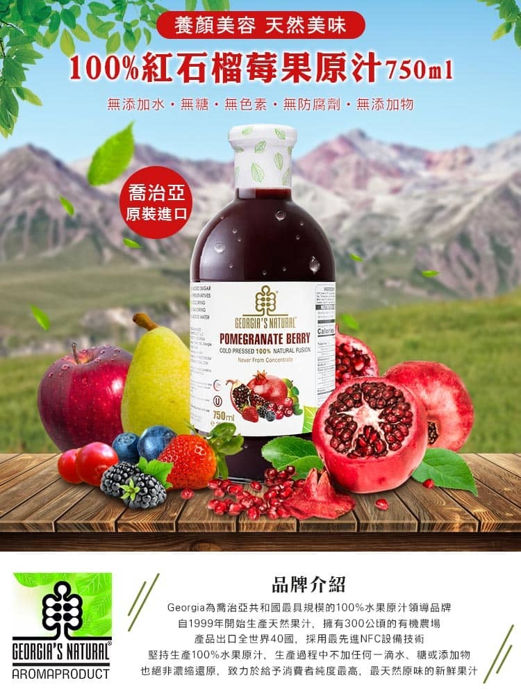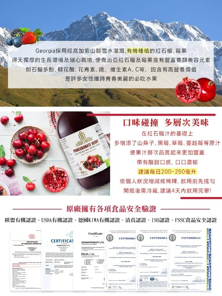 喬治亞原裝玻璃瓶,每瓶含有2公斤的紅石榴、草莓、黑莓、山桑子、蔓越莓冷壓鮮榨,過程中無加糖、非濃縮、無加水、無化學添加,冷壓製程保留營養元素,是100%紅石榴莓果原汁,同時獲得采園有機認證字號1-008-208651,有機原汁飲用更安心。