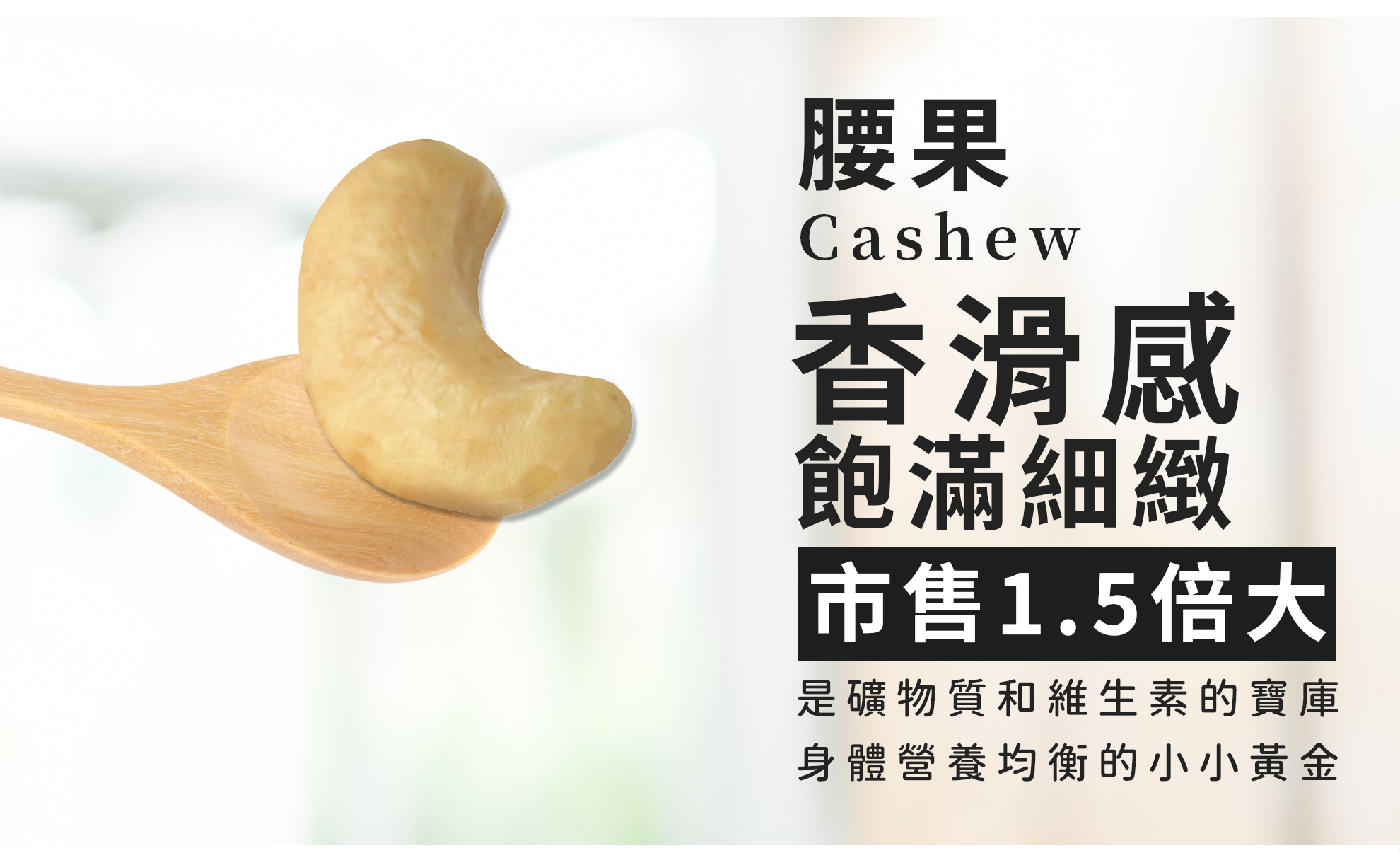 腰果是堅果中熱量最低的堅果,對於飲控是很好的零食,多元營養素,豐富蛋白質、omega3、維生素E、鈣質、胺基酸、鎂、鋅,均衡衛福部建議每日一把堅果,腰果會是您解饞或是健身後營養補充的堅果首選。