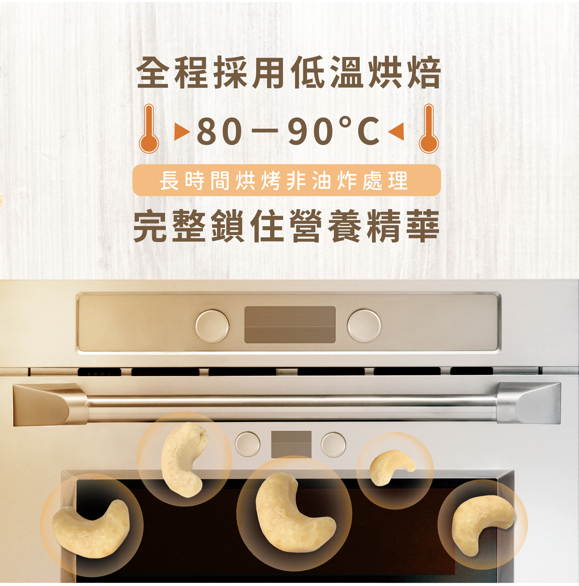 精選獨特熱帶雨林氣候產地越南特大腰果,選用WW180優質果仁規格,比市售腰果大1.5倍,經過耗時低溫烘焙釋放果仁原始香氣,無調味配方,無任何添加,兼具美味營養,酥脆爽口,扎實飽滿,香氣濃郁,是女性最愛的堅果之一。