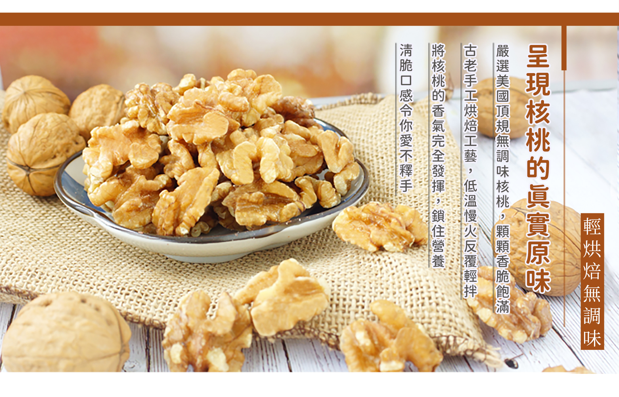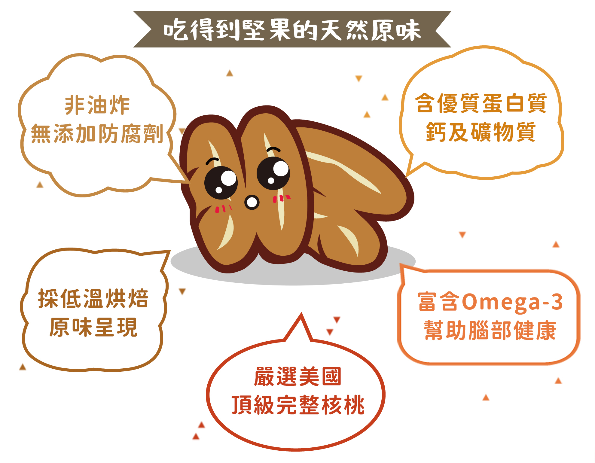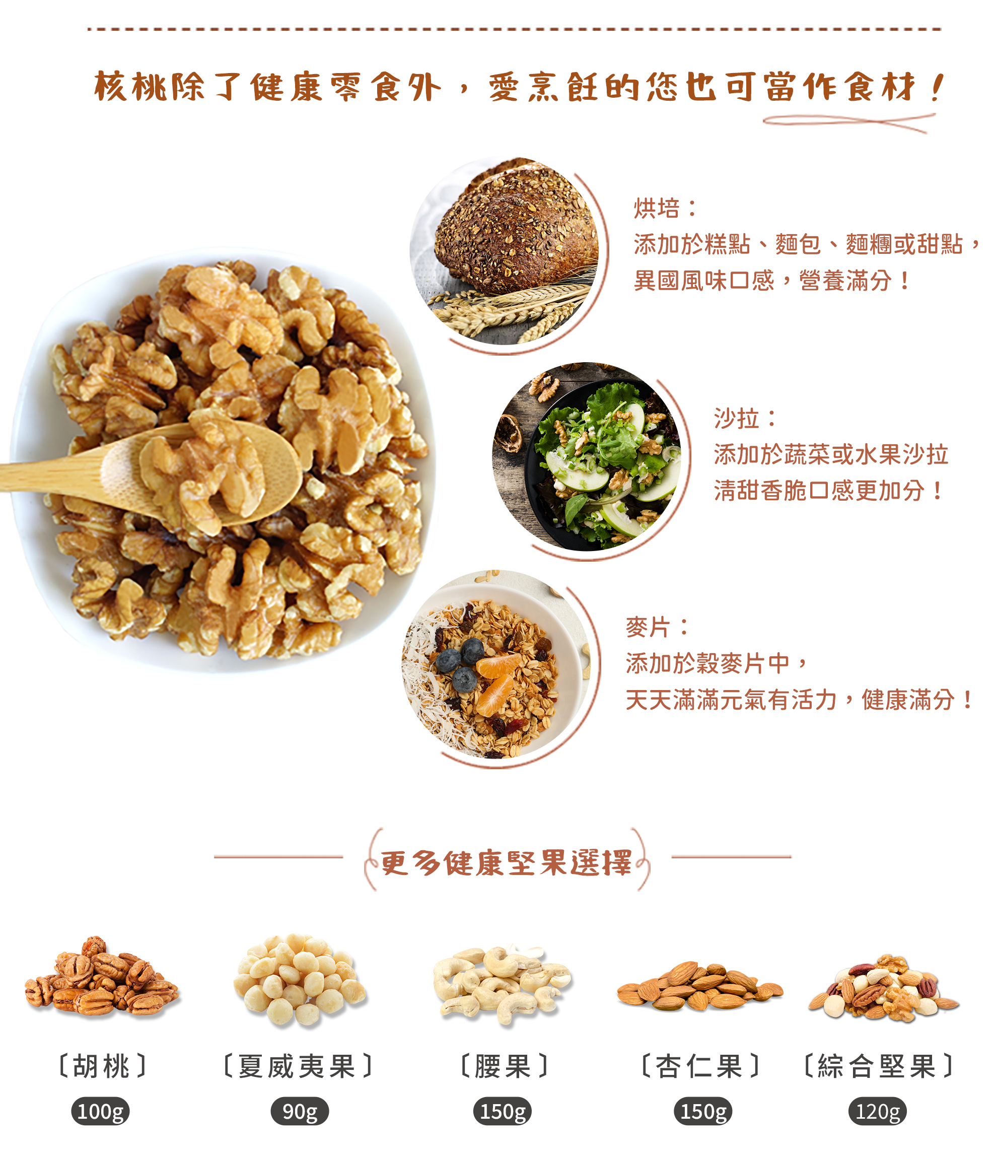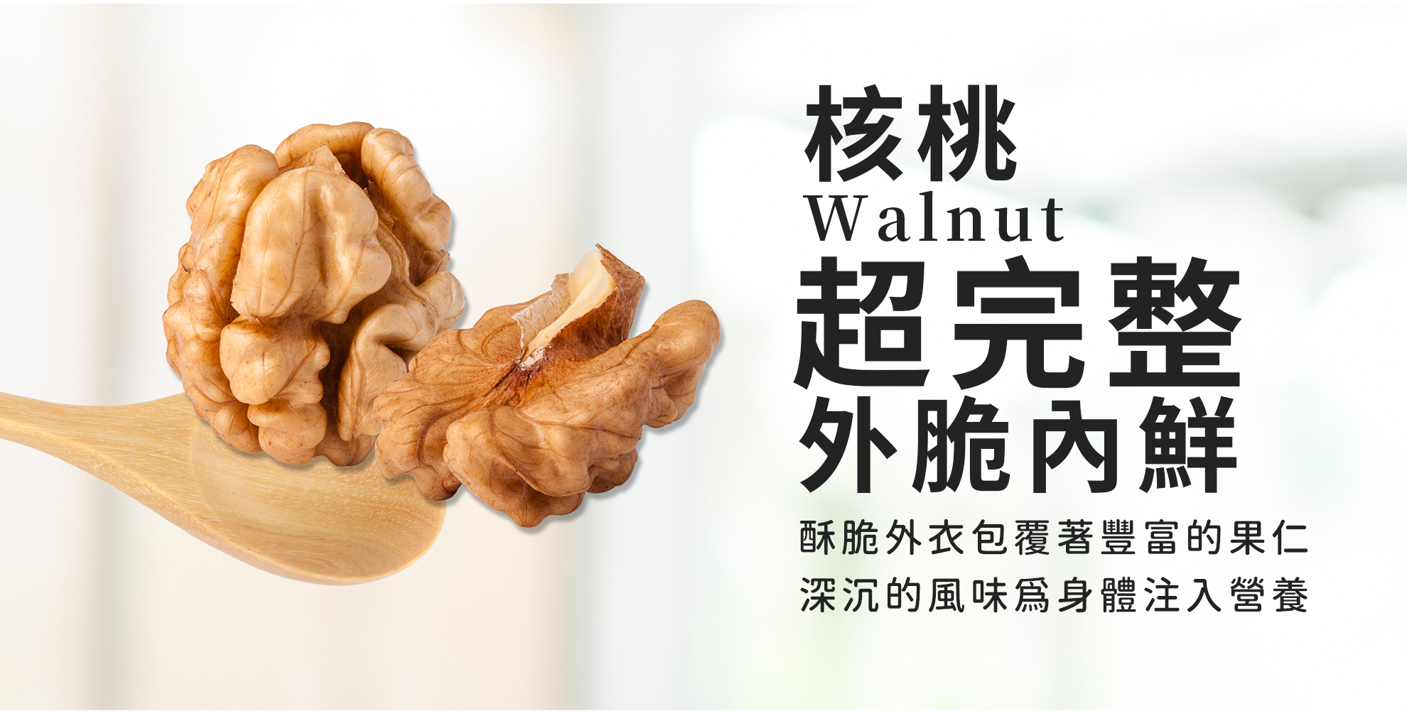 核桃有堅果之王美稱,具有豐富營養價值,對於飲控是很好的零食,多元營養素植物油脂,豐富蛋白質、omega3、維生素E、鈣質、胺基酸、鎂、鋅、硒,均衡衛福部建議每日一把堅果,核桃會是您解饞或是健身後營養補充的堅果首選。
