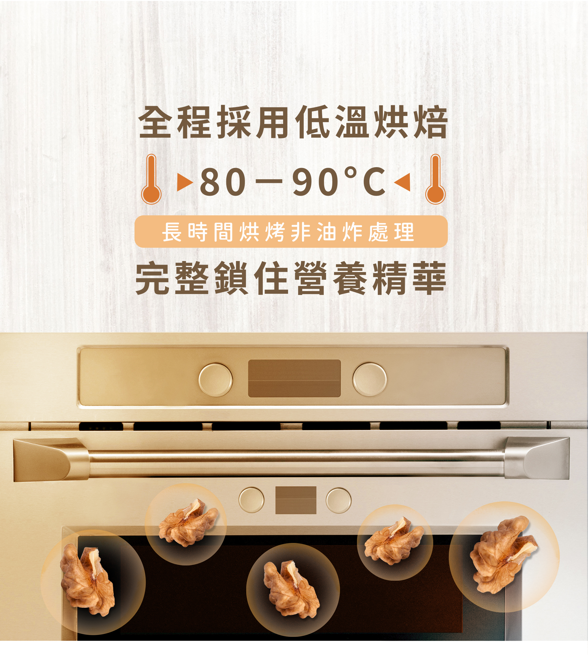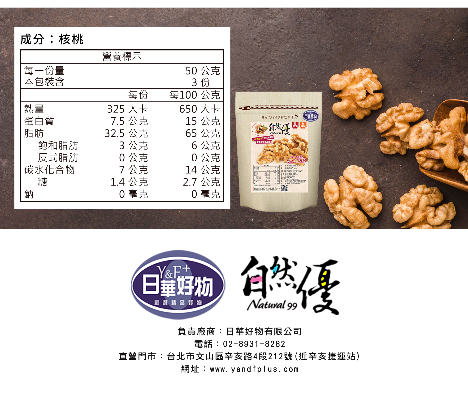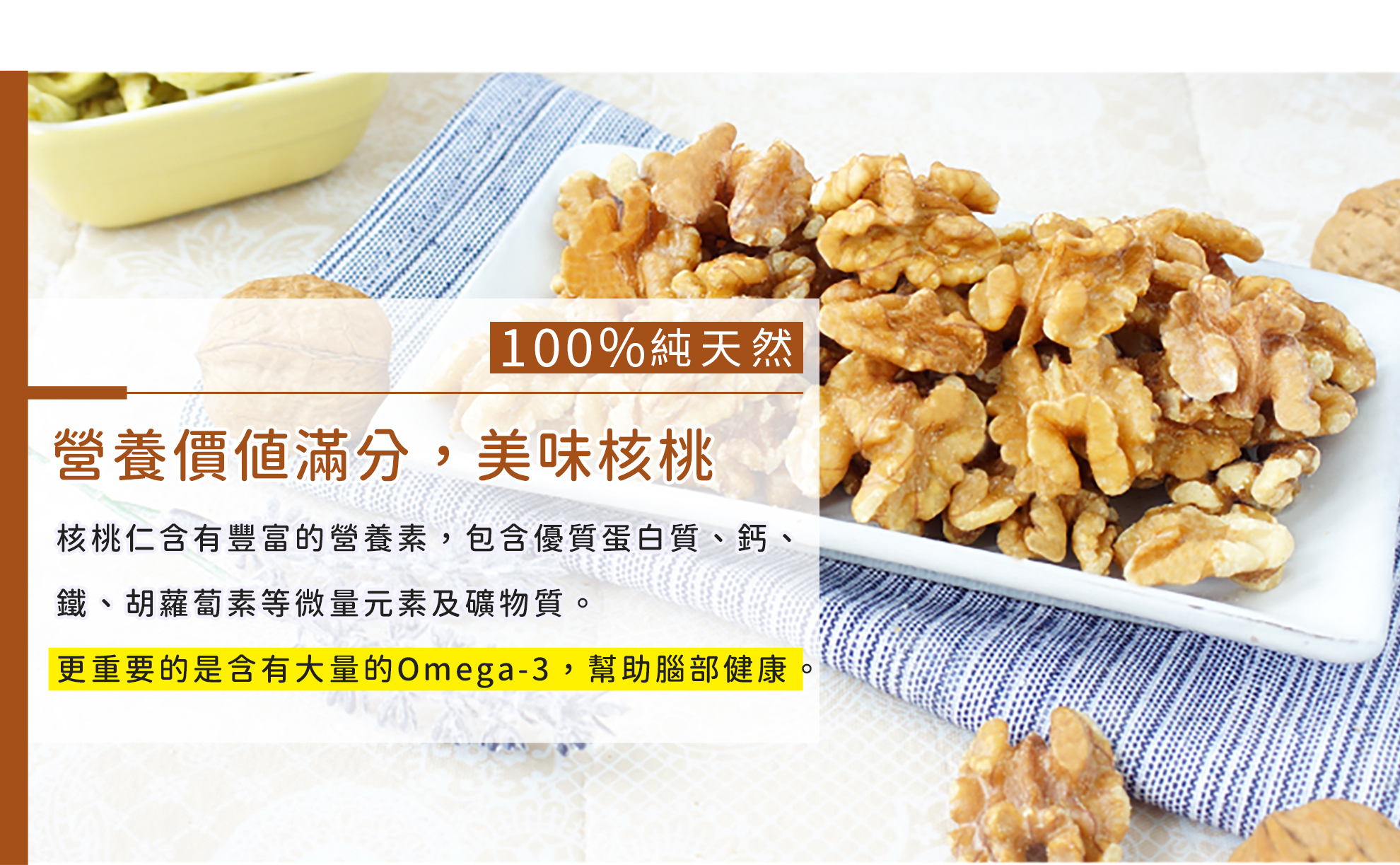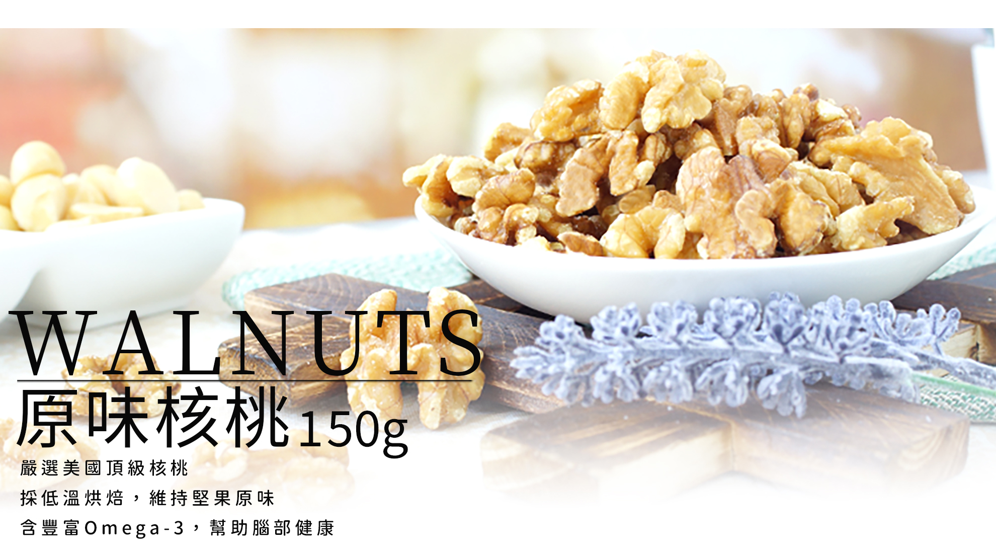 核桃有堅果之王美稱,具有豐富營養價值,對於飲控是很好的零食,多元營養素植物油脂,豐富蛋白質、omega3、維生素E、鈣質、胺基酸、鎂、鋅、硒,均衡衛福部建議每日一把堅果,核桃會是您解饞或是健身後營養補充的堅果首選。