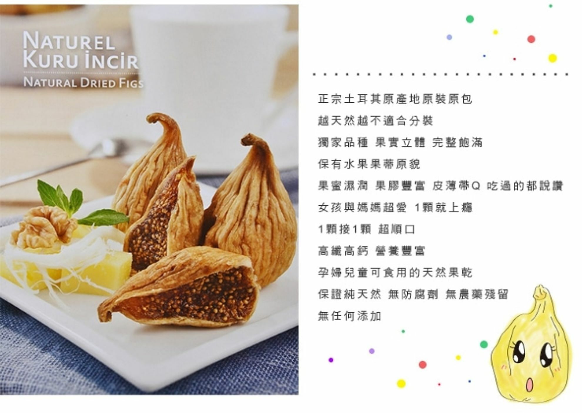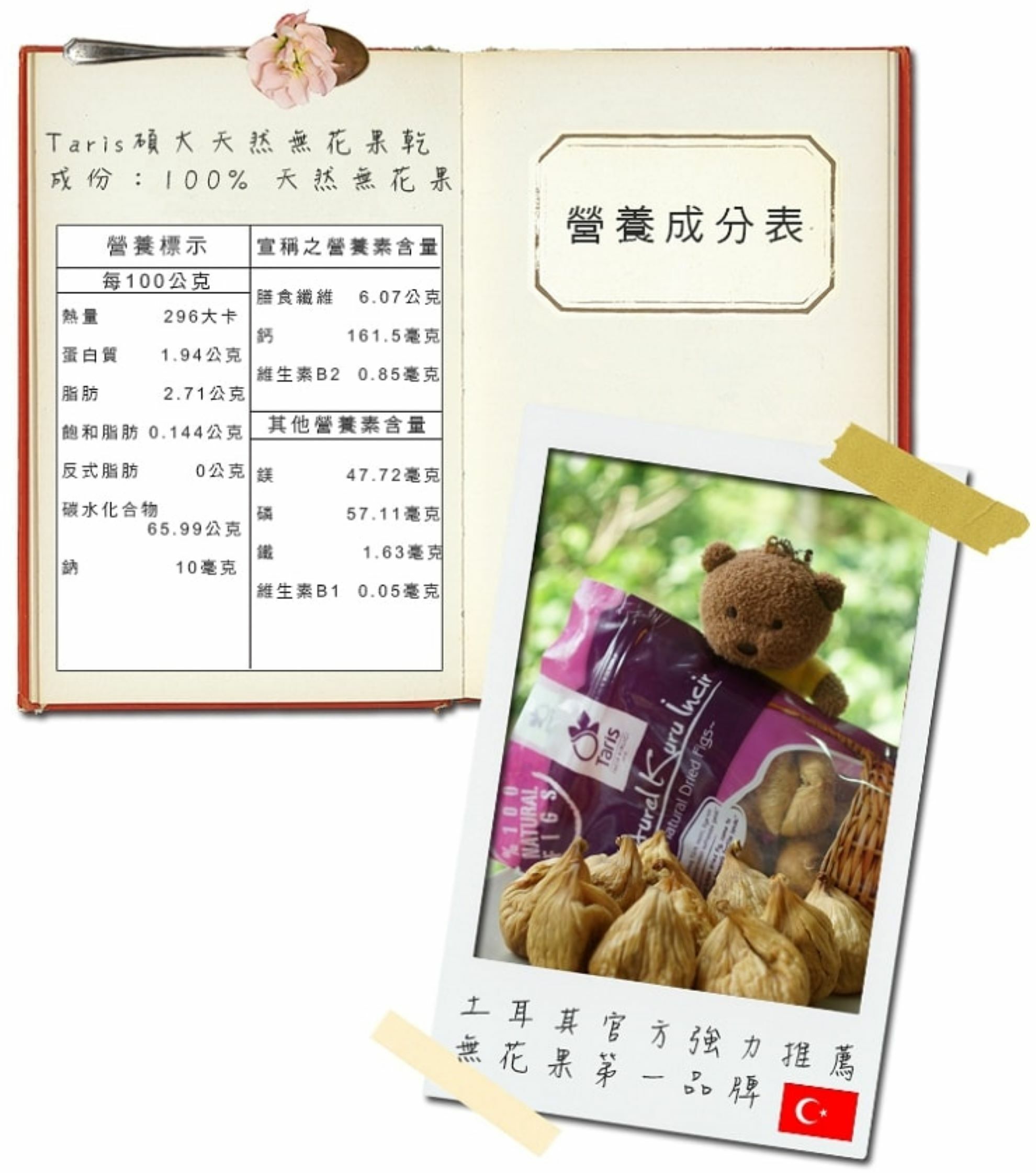 TARIS無花果乾果實碩大,果肉飽滿,果膠濃郁,果蜜濕潤,Q軟好吃不膩,無加糖、無防腐劑、無農藥殘留,100%純天然無花果乾,非來路不明經糖漬或漂白的無花果乾。