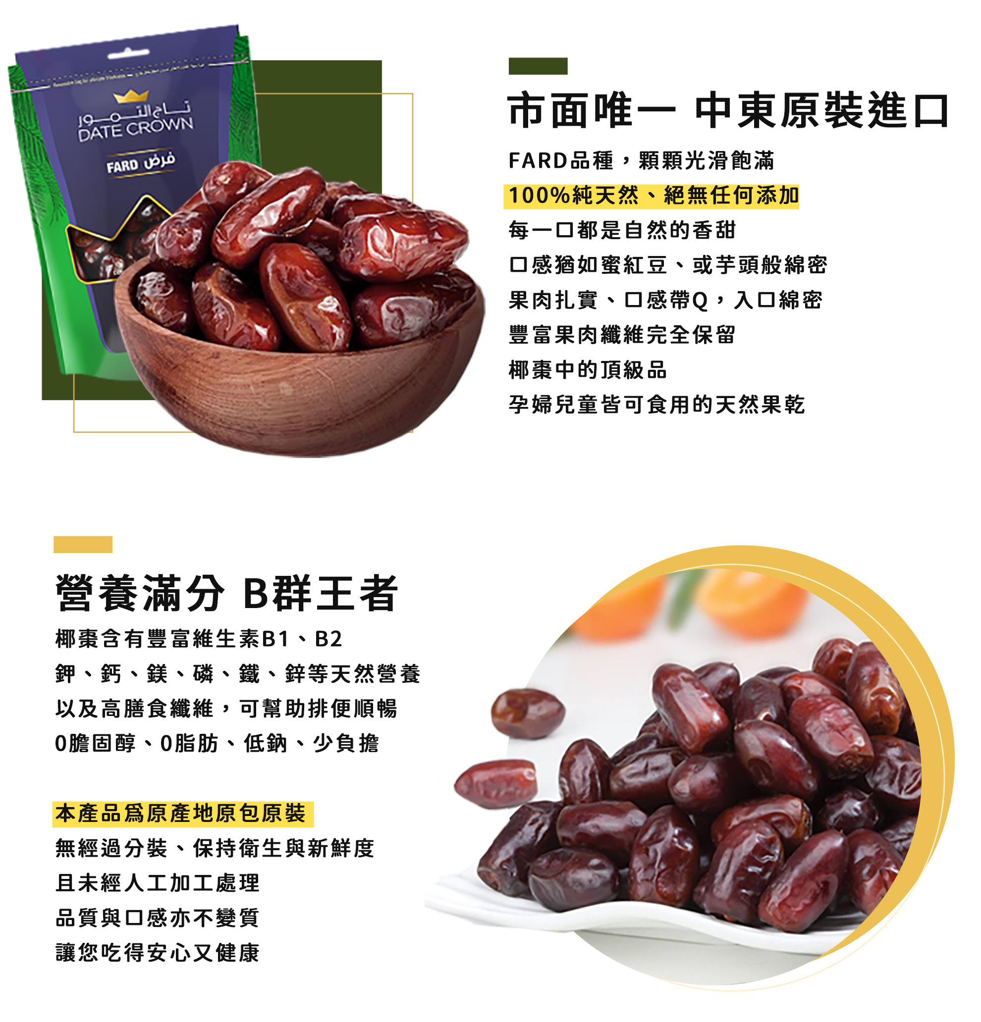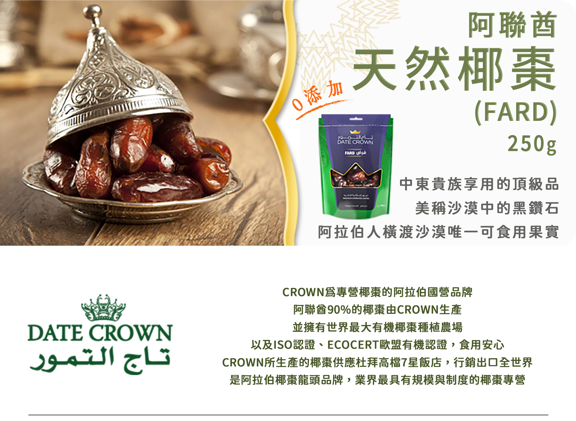 嚴選阿聯酋國營品牌CROWN椰棗,是中東椰棗權威,100%天然椰棗,非伊朗椰棗,經天然風乾日曬,保留椰棗天然養分,無添加糖、無任何添加物,農藥殘留、大腸桿菌檢驗合格,食用安心。