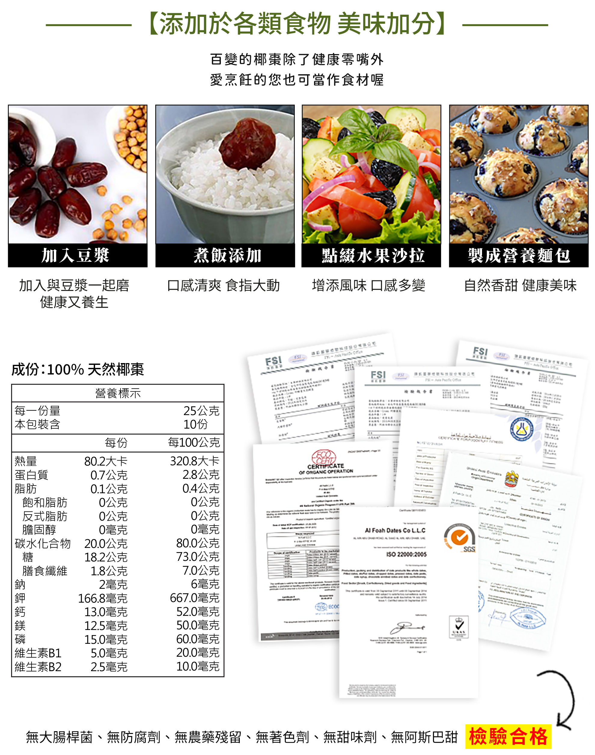 椰棗是古代阿拉伯人橫渡沙漠唯一可食用果實,有沙漠麵包稱號,椰棗營養極高,B群、纖維、果膠、鈣、鐵、鎂、磷、胡蘿蔔素,椰棗成分主要為單醣,易吸收消化,日本也將椰棗納入美容寶庫的聖品,國際農糧組織也將椰棗納入為糧食之一,1日7顆椰棗滿足一日所需。
